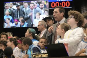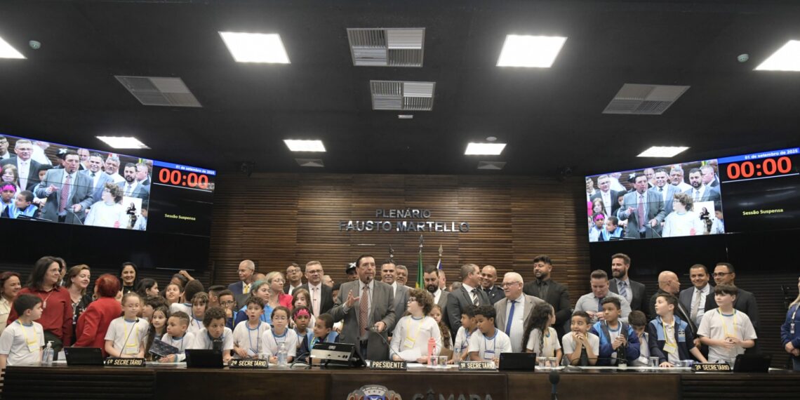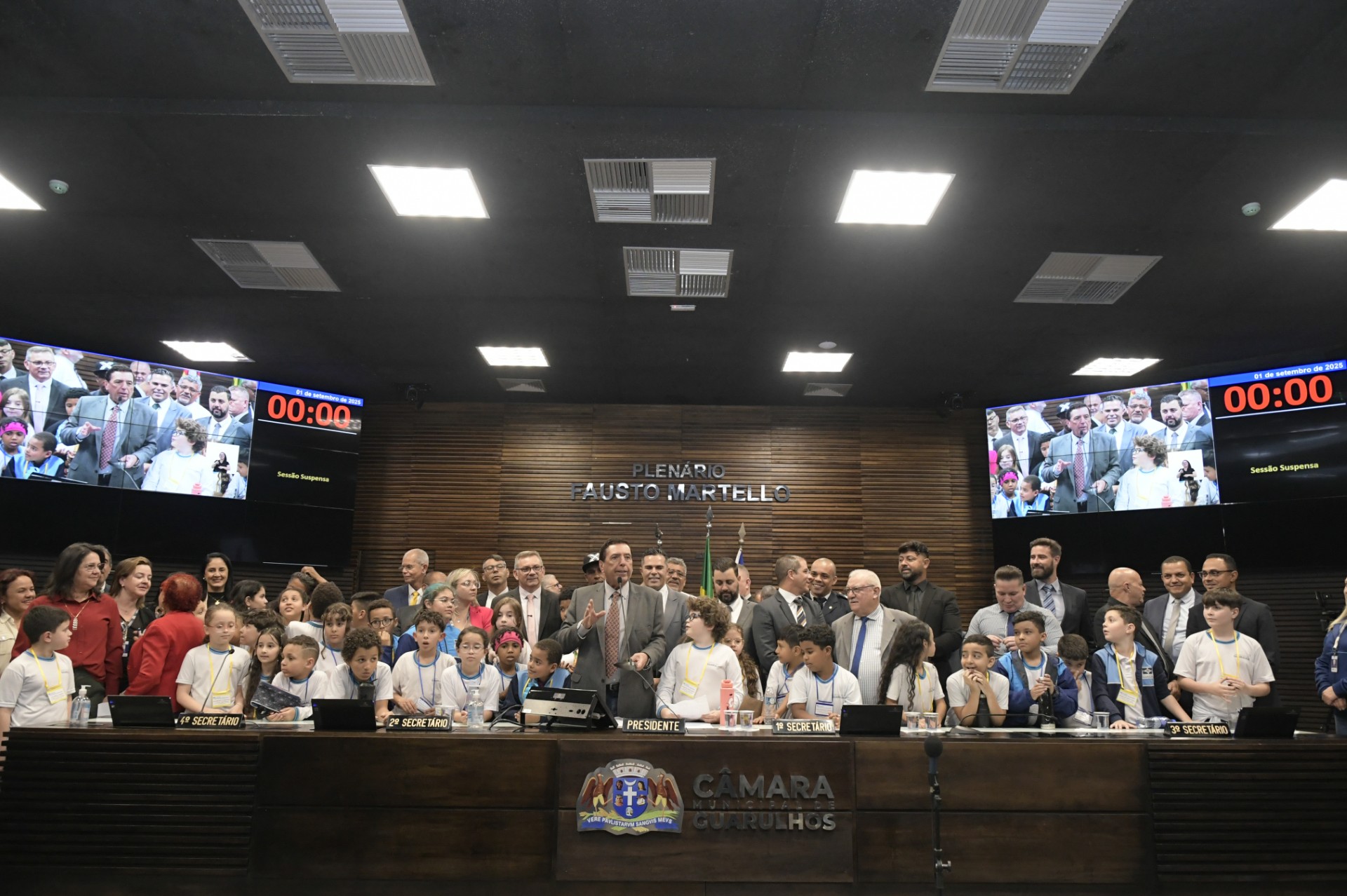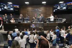 Atendendo a um pedido do vereador Geraldo Celestino (Mobiliza), o presidente da Casa, Martello (Republicanos), suspendeu temporariamente a sessão legislativa para que os estudantes, que acompanhavam os trabalhos da galeria, pudessem ocupar o plenário e conhecer de perto o funcionamento da Câmara.